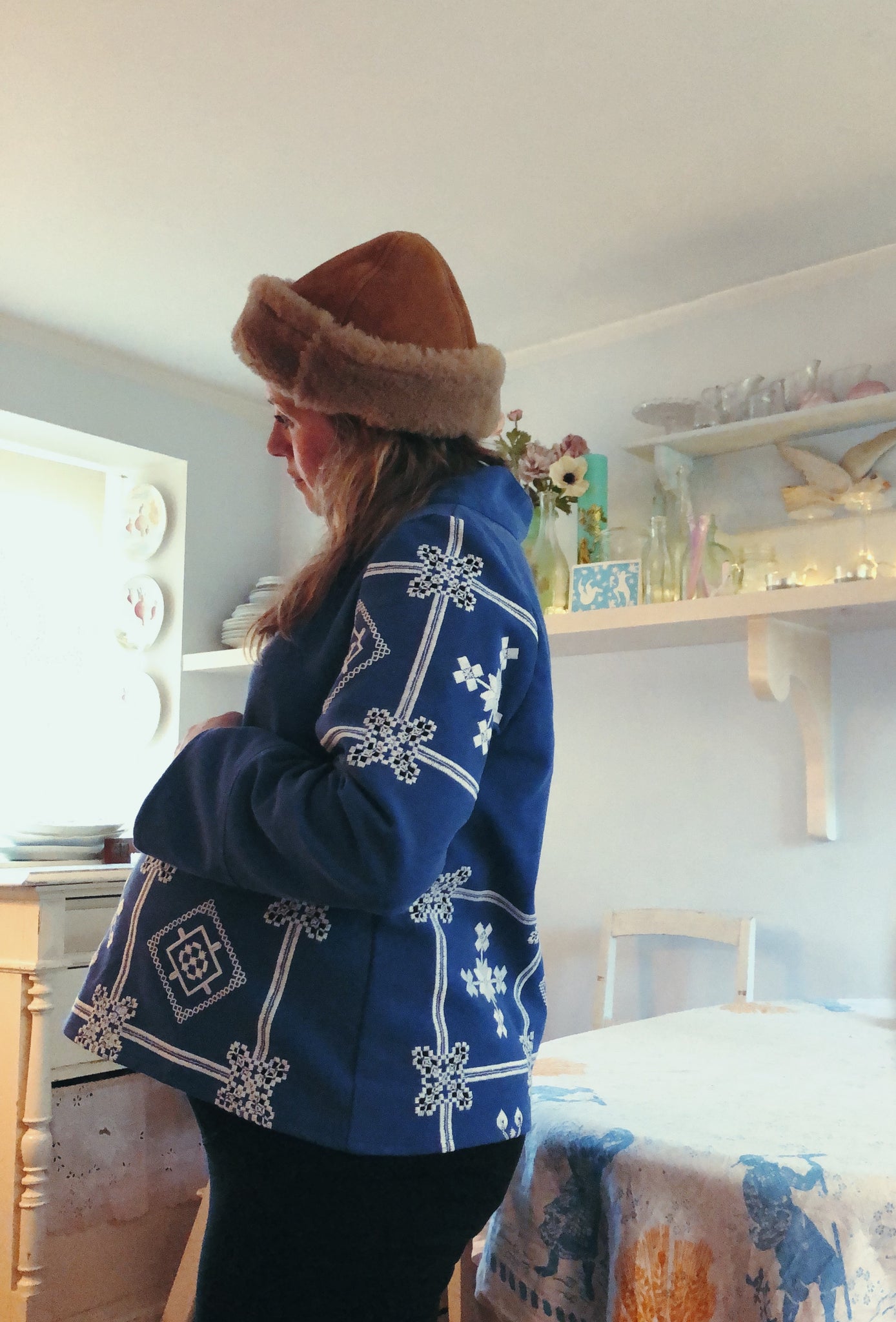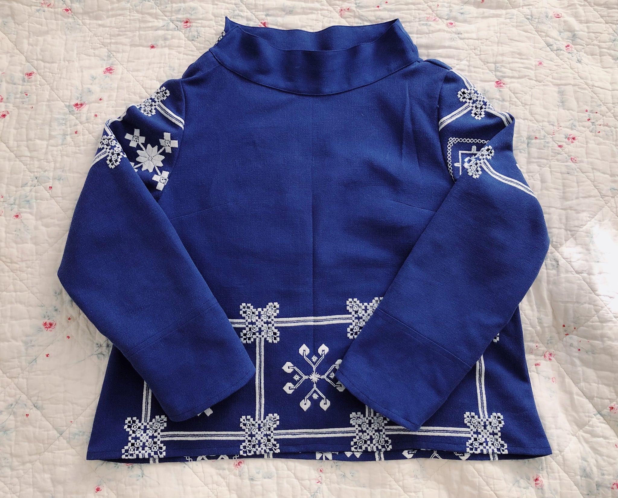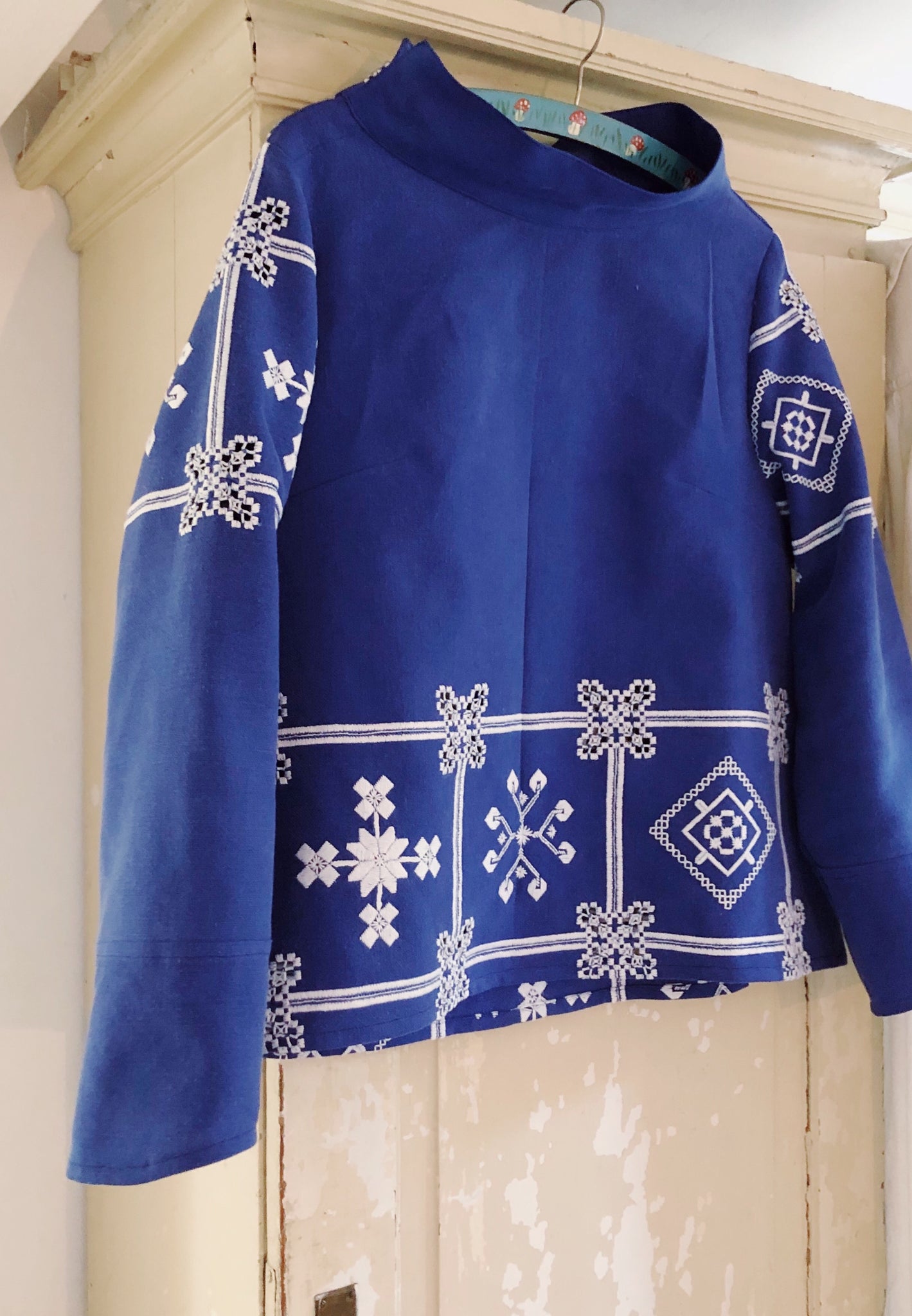 - thick dark blue tablecloth (gently worn) with white embroidery (some of the embroidered shapes are designed with small holes- see sleeve detail image for example)