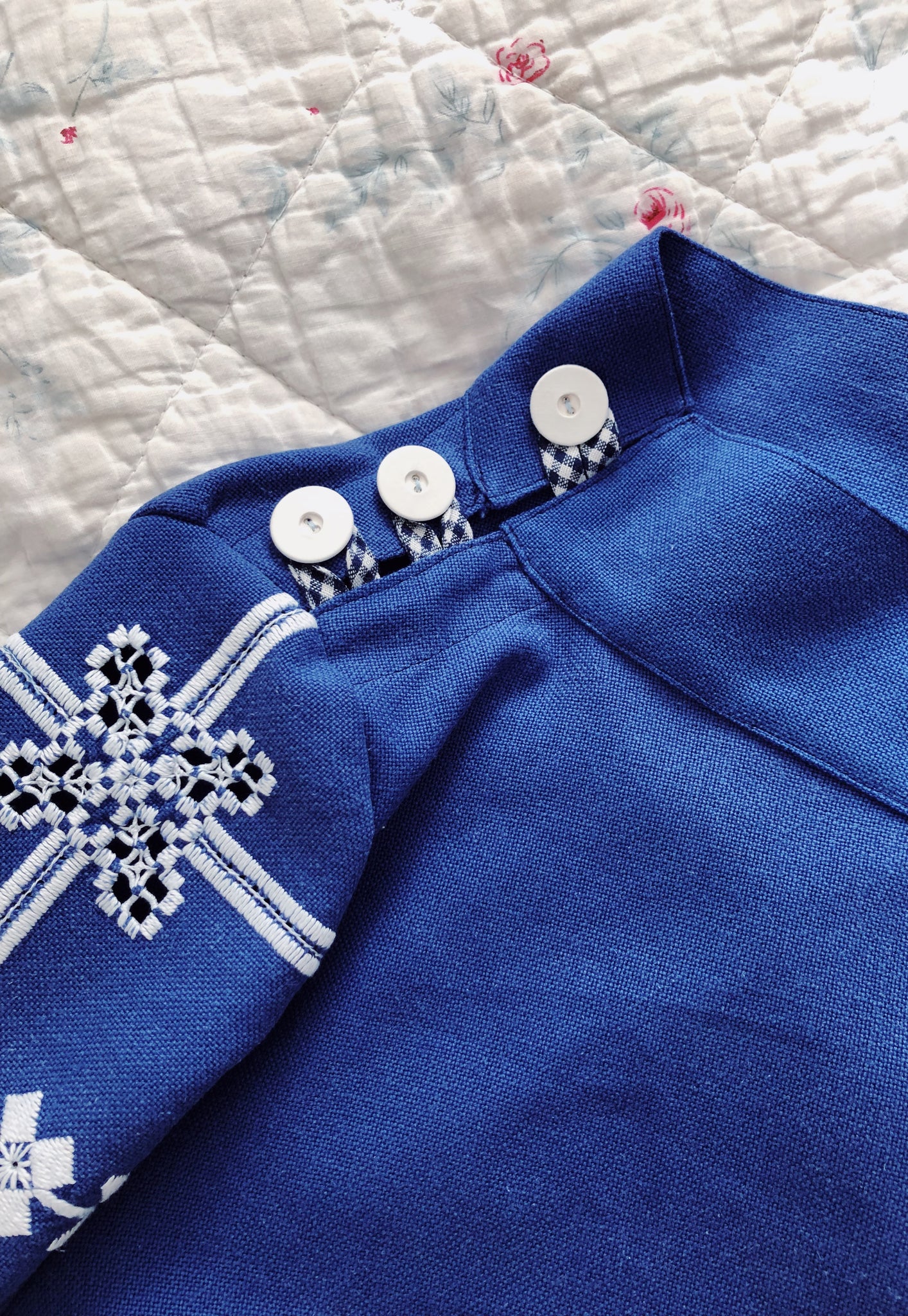 - vintage white buttons on right shoulder with rouleau loops in blue and white gingham