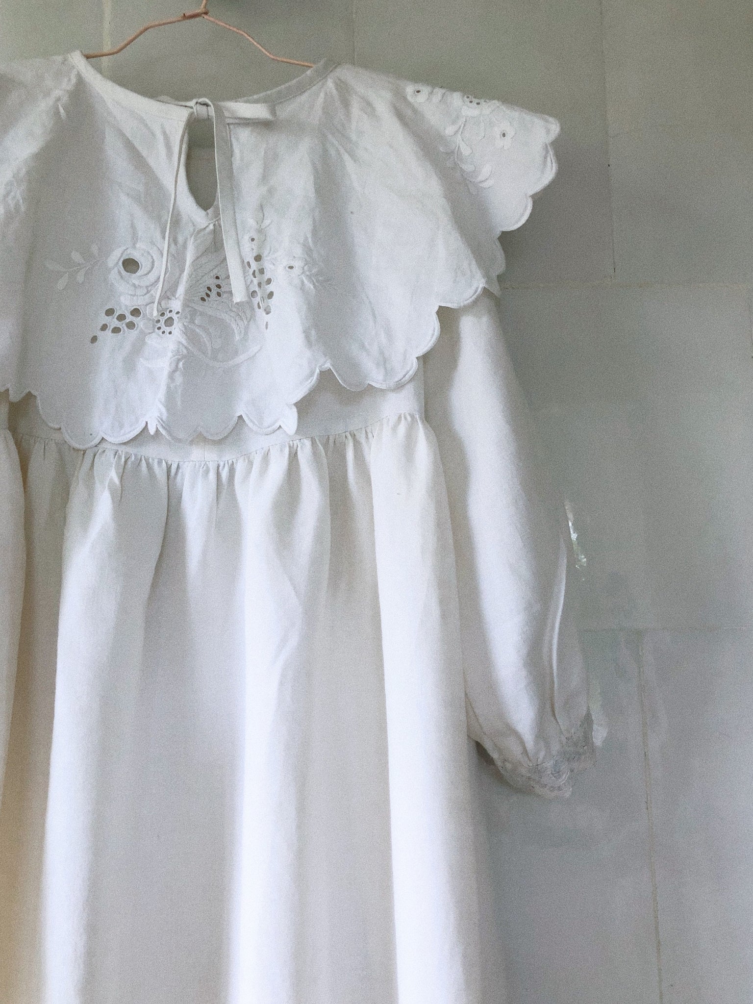 - vintage white fabric used as collar with embroidered cutwork that gathers slightly at the back