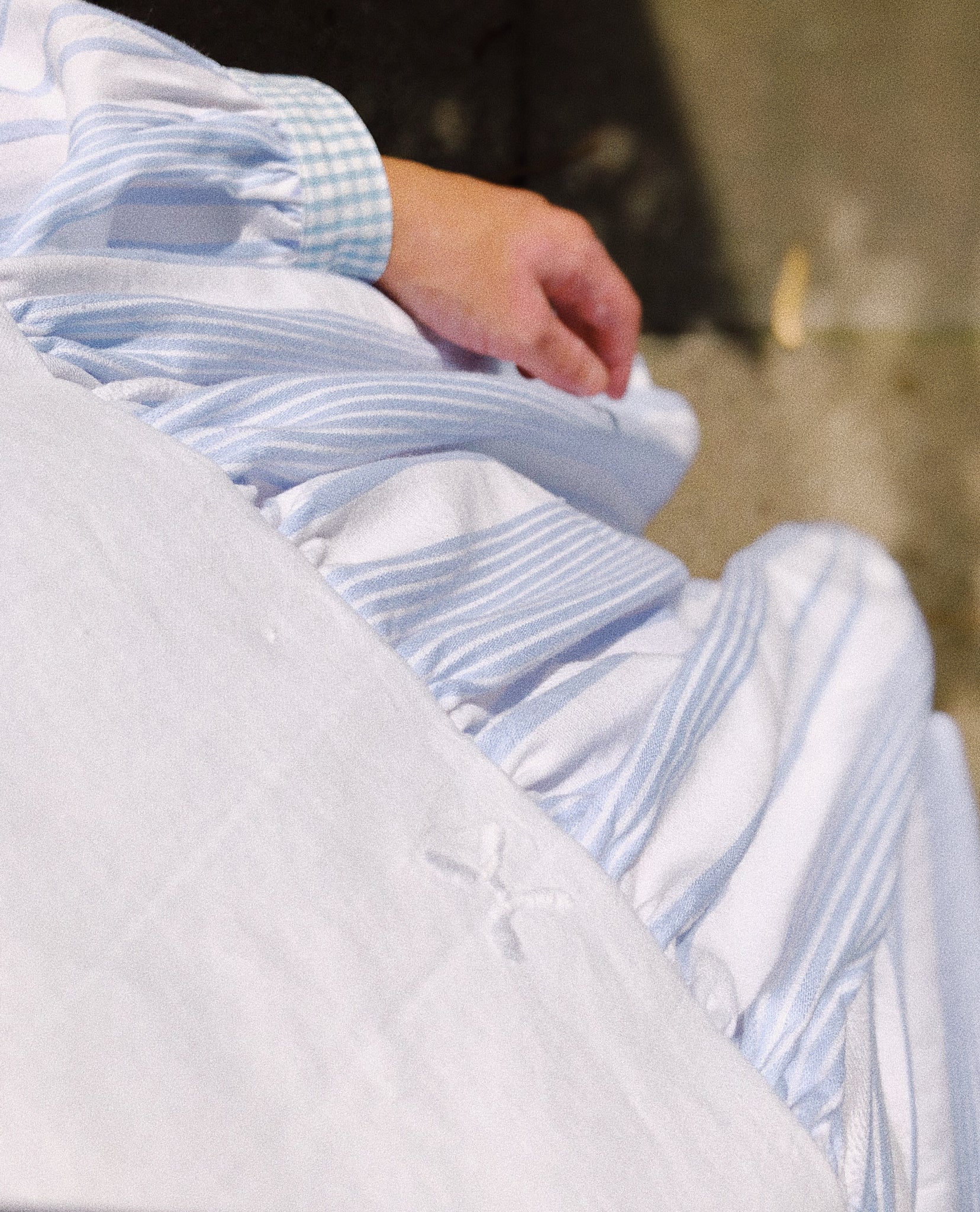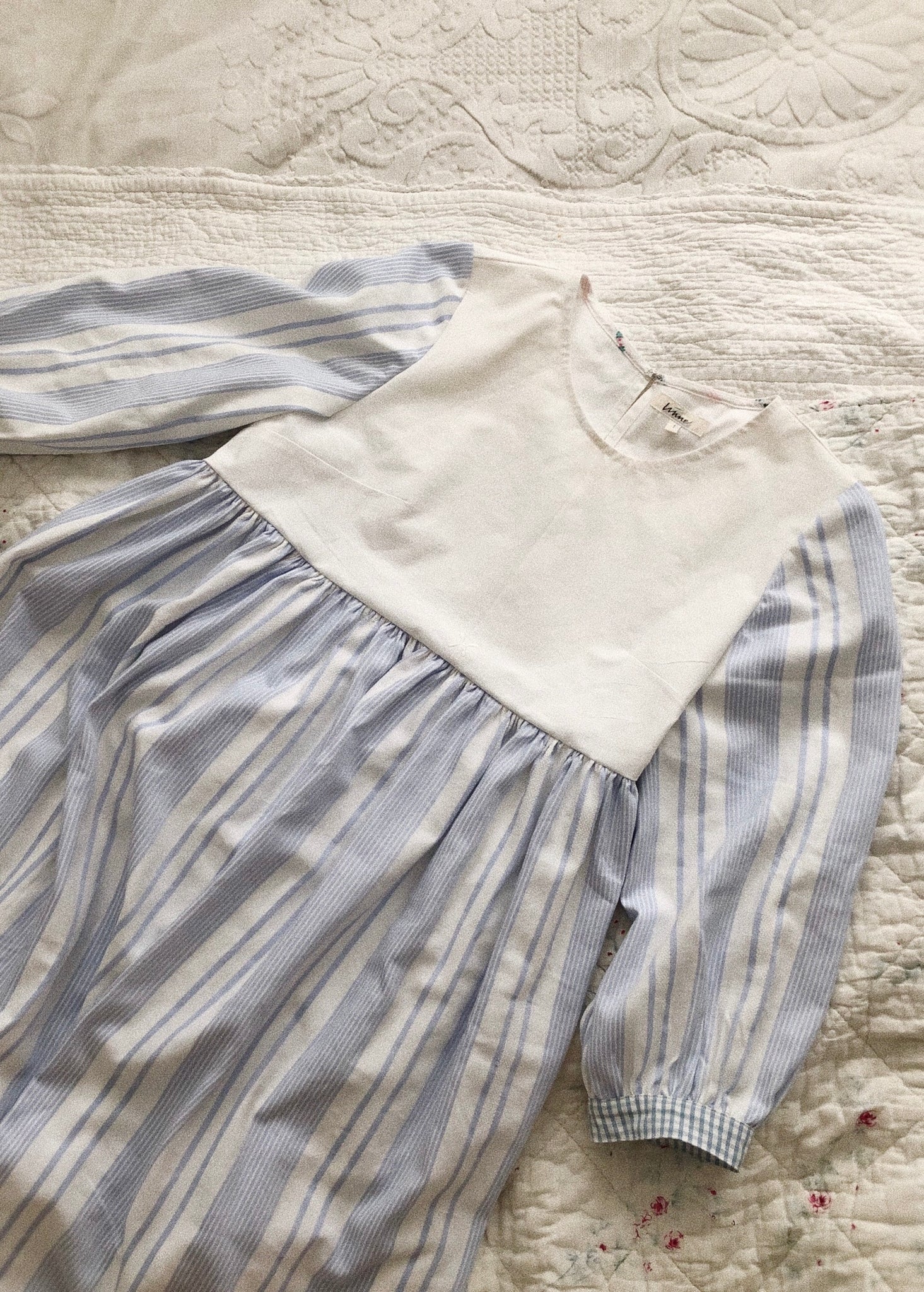 - pale blue and white striped skirt and sleeves with small blue and white gingham cuffs